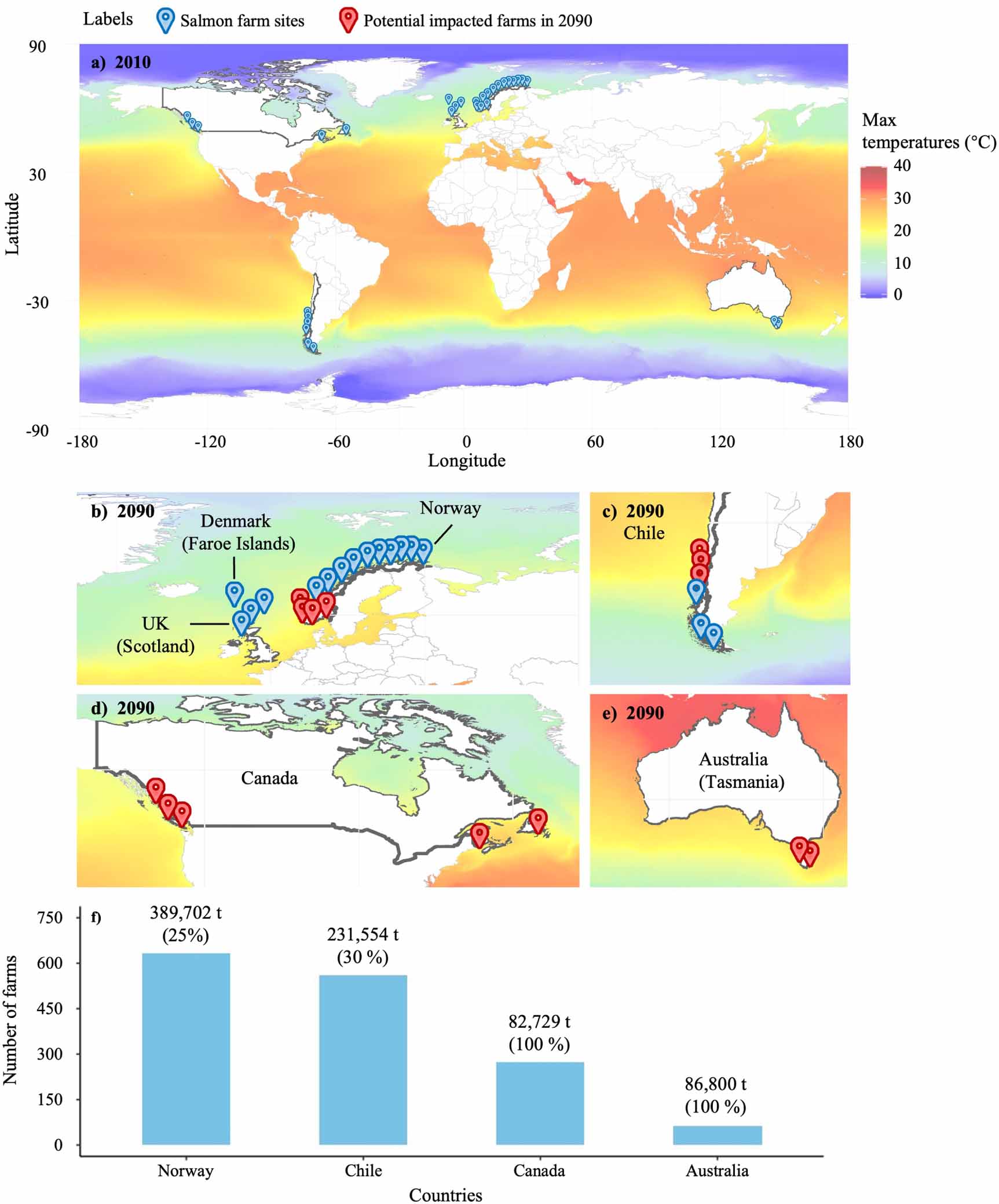 Actualmente, las condiciones térmicas en estas zonas oscilan entre 10,5 °C y 18 °C. Sin embargo, el calentamiento proyectado implicará que cientos de centros de cultivo operen bajo estrés térmico: 633 centros en Noruega, 568 en Chile, 274 en Canadá y 63 en Australia