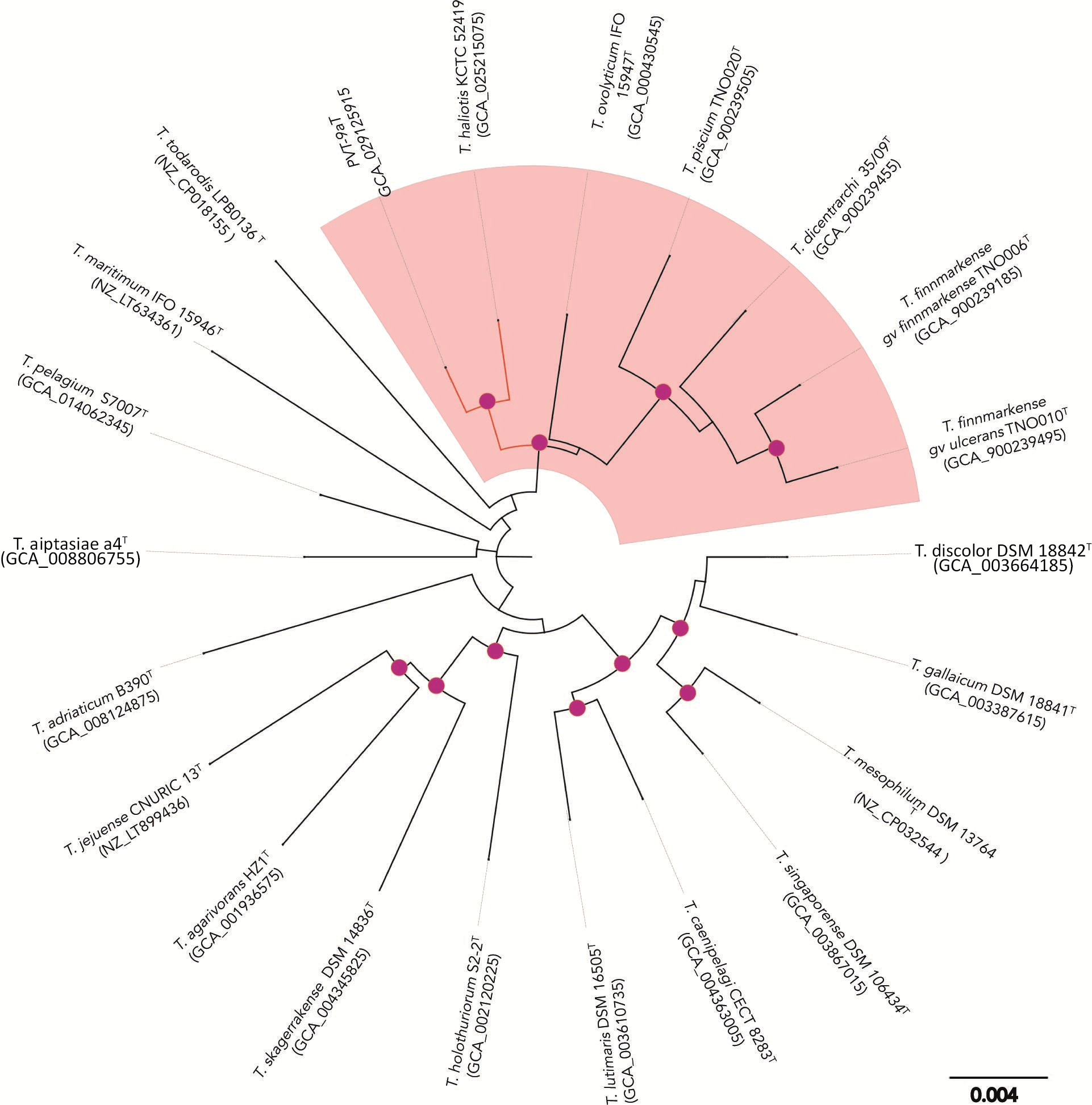 Hasta la fecha, en salmónidos cultivados en Chile el equipo liderado por el Dr. Avendaño-Herrera ha descrito las especies T. dicentrarchi, T. maritimum, T. finnmarkense, T. ovolyticum y descrito las nuevas especies T. piscium (descubierta el año 2020) y ahora T. bernardetii.